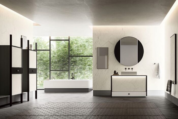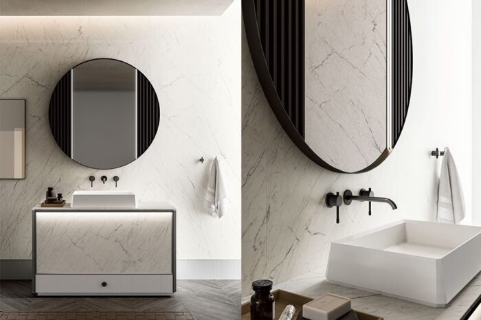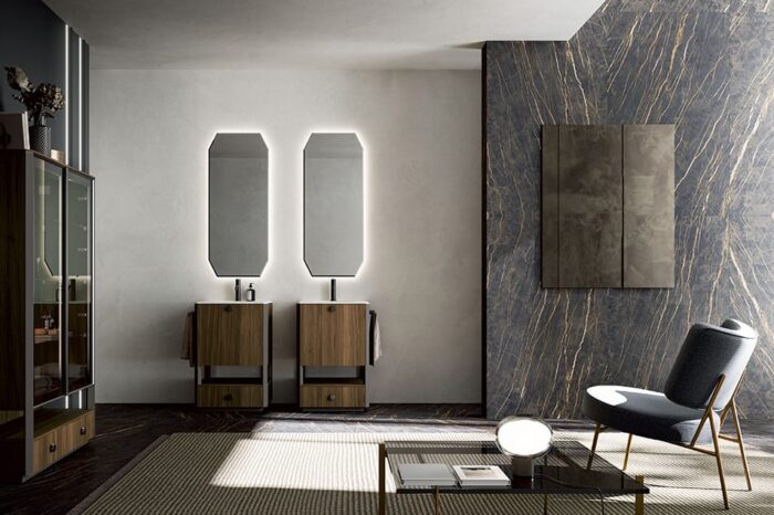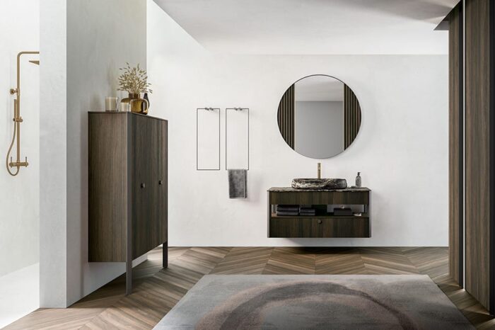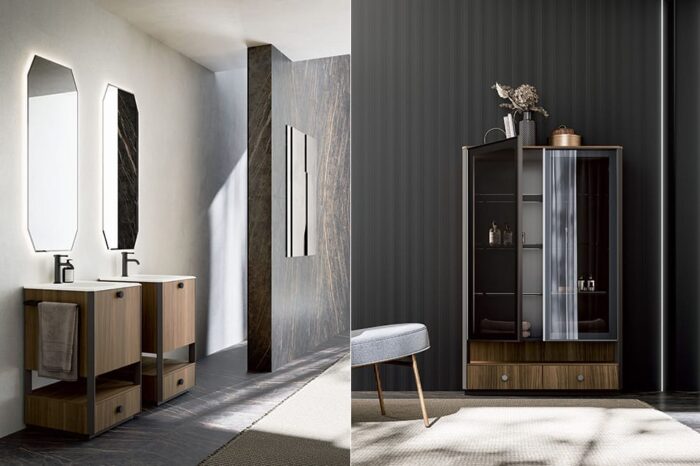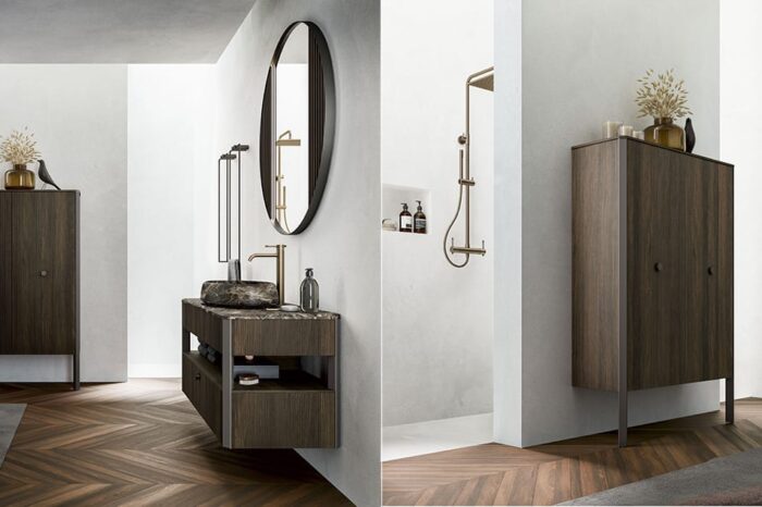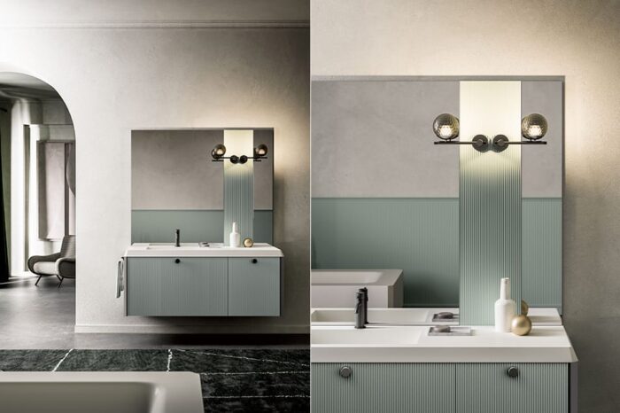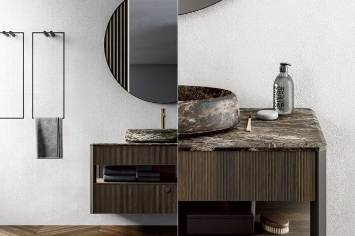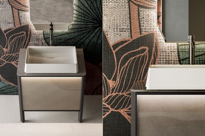 The HONEY collection is a premium, versatile furniture system – the finest materials clothe and portray an iconic aesthetic for the bathroom, illuminated by the warmth of a light that is incorporated in the details and echoes between façades and mirrors. The 3D effect is one of the distinctive elements in the collection, both as a front variant and when inserted in the novel metal frame whose light, placed beneath the door grip, further emphasises the three-dimensional texture, thus establishing the uniqueness of the design and creating a magical atmosphere in the environment. Each detail possesses its own intrinsic uniqueness, the result of research and emotion translated into design, which exalts the character of the environment in which it is placed. Honey embodies the optimum fusion of materials and design features, creating a majestic concept whose details are revealed in the dialogue between unique environments, shapes and finishes.