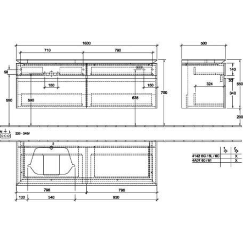 Villeroy & Boch Legato 4 Drawer Wall Hung Vanity Unit With Overflow LH 600mm Basin, Overflow, Led Light – 1600mm Wide